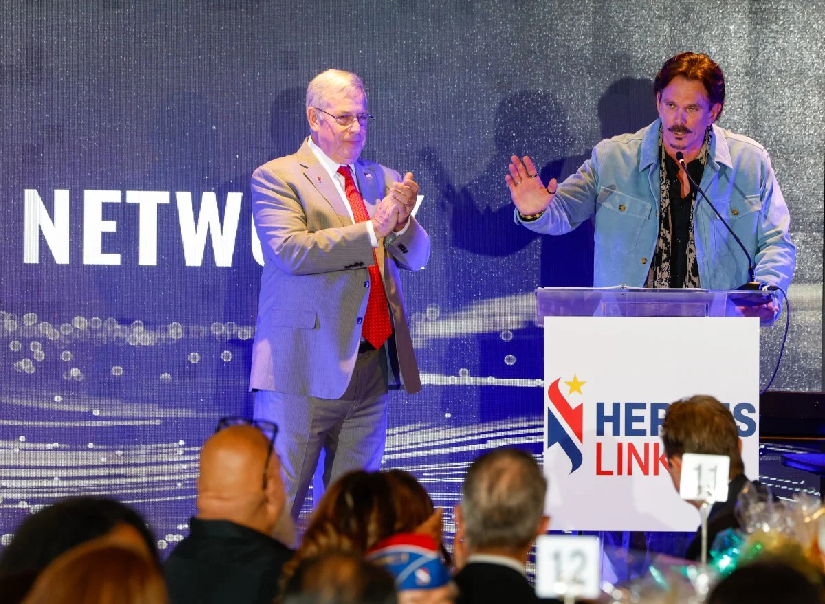 Devin Reeve addresses the 2024 Heroes Linked Gala audience in Los Angeles. At left, is Heroes Linked Board Chair Bob Jerome.